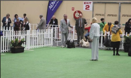 The judging of the Scottish Terriers was very late on the first day of the Royal Show, and as exhibitors by then after a day of talking and answering questions on Scottish Terriers, plus the many snacks, etc., we wearily made our procession to the judging ring to do battle.
