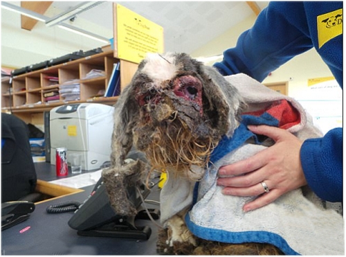 Abandoned dog whose hair was so matted its leg became stuck to its EAR and had to be anaesthetised before his coat could be shaved off June 17